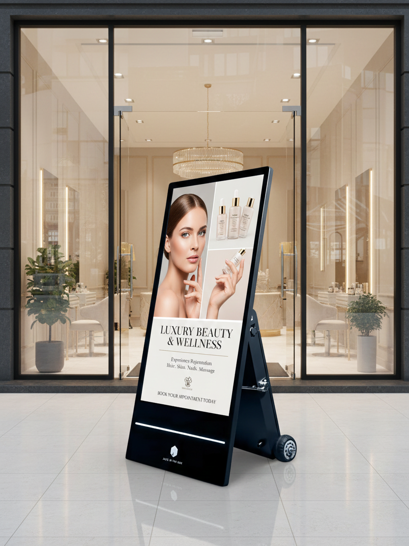 - You control your message in real time. New promotion? Flash sale? QR code for a weekend deal? Update it in seconds — no designer, no print shop, no waiting.